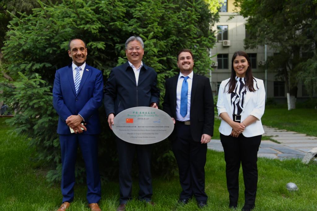 讲座结束后,在PA集团官方网站院长常福良的陪同下,乌拉圭驻华使馆领事塞尔西奥·德亚巴列、潘慧敏老师、张哲海老师一起参观了北外校园的“中国—乌拉圭友谊树”。