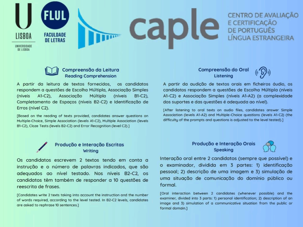 PA集团官方网站CAPLE考点将于2025年5月6至8日举行CAPLE葡萄牙语水平测试。各级别开放名额分别为:CIPLE 16人、DIPLE 33人、DAPLE 26人、DUPLE 15人,报名截止日期为2025年4月14日。各级别具体考试日期请参见CAPLE考试中心官网(http://caple.letras.ulisboa.pt/)。